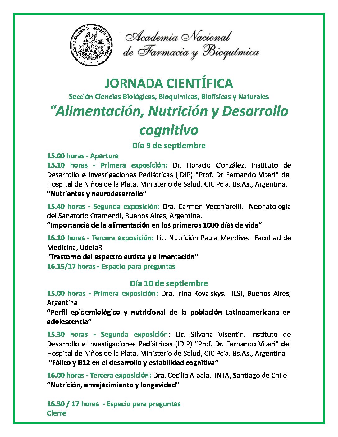 El 9 y 10 de septiembre pasado tuvieron lugar en la Academia Nacional de Farmacia y Bioquímica las Jornadas de “Alimentación, Nutrición y Desarrollo Cognitivo” organizadas por la Sección de Ciencias Biológicas, Bioquímicas, Biofísicas y Naturales. Las mismas contaron con la participación de expositores nacionales, de Chile y de Uruguay. Coordinaron las respectivas mesas las Académicas María Cristina Añón y María Luz Pita Martín. Durante su desarrollo se presentaron y discutieron diferentes temas, desde el efecto de los nutrientes en el neurodesarrollo hasta aspectos relacionados con el trastorno del espectro autista y la nutrición. Se analizó también la importancia que tiene la nutrición desde la gestación y el recién nacido pretérmino durante los primeros 1000 días de vida de niños y niñas, el desequilibrio del perfil nutricional de los adolescentes en Latino América, la necesidad de consumo de ácido fólico y vitamina B12 para un buen desarrollo y estabilidad cognitiva, y finalmente la relación entre nutrición y un envejecimiento saludable. Se resaltaron las funciones de los ácidos grasos esenciales para el desarrollo neuronal en los primeros años de vida, la importancia de su aporte en la alimentación materna y en la dieta de los adultos mayores, para prevenir el deterioro cognitivo.