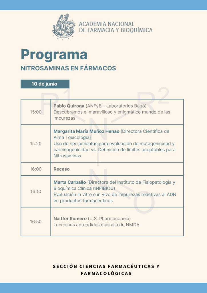 El hallazgo se difundió en todos los medios gráficos y audiovisuales y en ocasiones con títulos sensacionalistas que llevaron gran preocupación a la comunidad en general y a los consumidores de los productos involucrados, se constituyó así en un factor de presión adicional para las autoridades regulatorias. En abril del año 2023, la respuesta a esa presión se traduce en la publicación de la guía ICH M7 que armoniza conceptos y estrategias para la evaluación y control de éstas y otras sustancias mutagénicas en productos farmacéuticos de forma de limitar su riesgo carcinogénico. En este contexto, la sección de Ciencias farmacéuticas y farmacológicas convoca a un grupo de expertos que desarrollarán algunos de los aspectos cubiertos por la guía, tales como el empleo de sistemas QSAR para la identificación de alertas estructurales, ensayos recomendados de mutagenicidad in vitro e in vivo, análisis del riesgo de su presencia en IFAs o productos terminados, métodos analíticos propuestos para la cuantificación en caso de ser necesario. Asimismo, durante la jornada se someterá a discusión el impacto de otras fuentes de exposición a nitrosaminas, distintas al medicamento, tales como alimentos o su formación endógena.