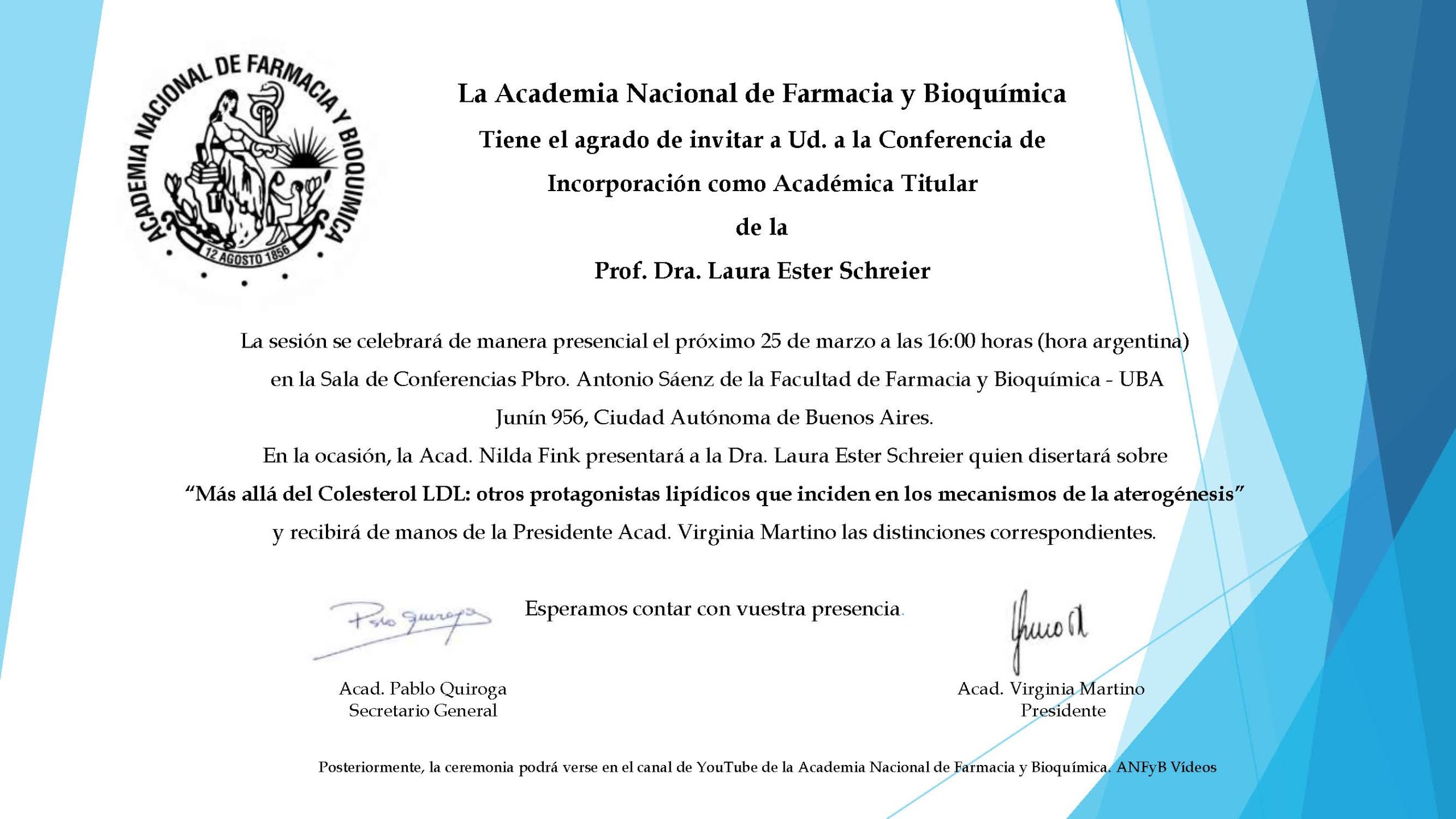 La Academia Nacional de Farmacia y Bioquímica tiene el agrado de invitarlos a la Sesión Pública de incorporación como Académica Titular de la Prof. Dra. Laura Ester Schreier.