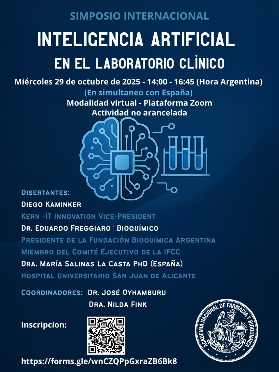 El miércoles 29 de octubre de 2025 se desarrollará (en simultáneo con España) el Simposio Inteligencia Artificial en el Laboratorio Clínico.